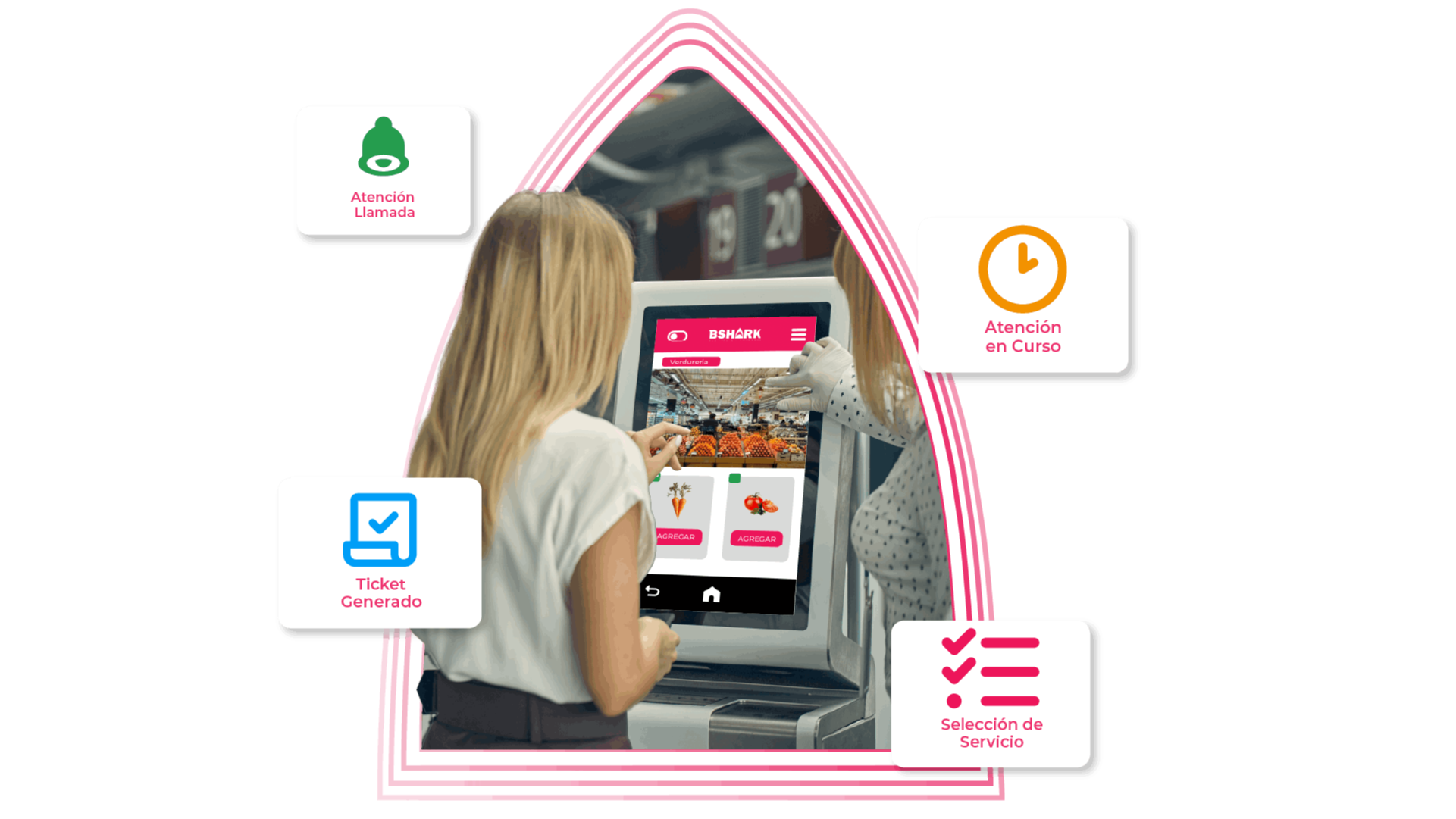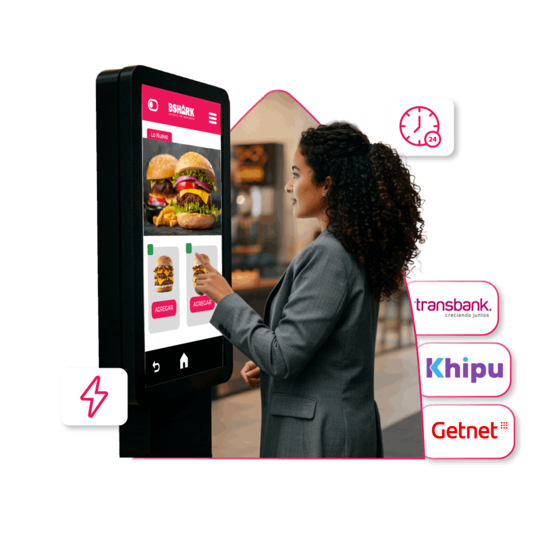 BSHARK Kiosko permite a tus clientes realizar pedidos, pagos o gestiones directamente desde un terminal digital, reduciendo filas y optimizando la operación de tu negocio.